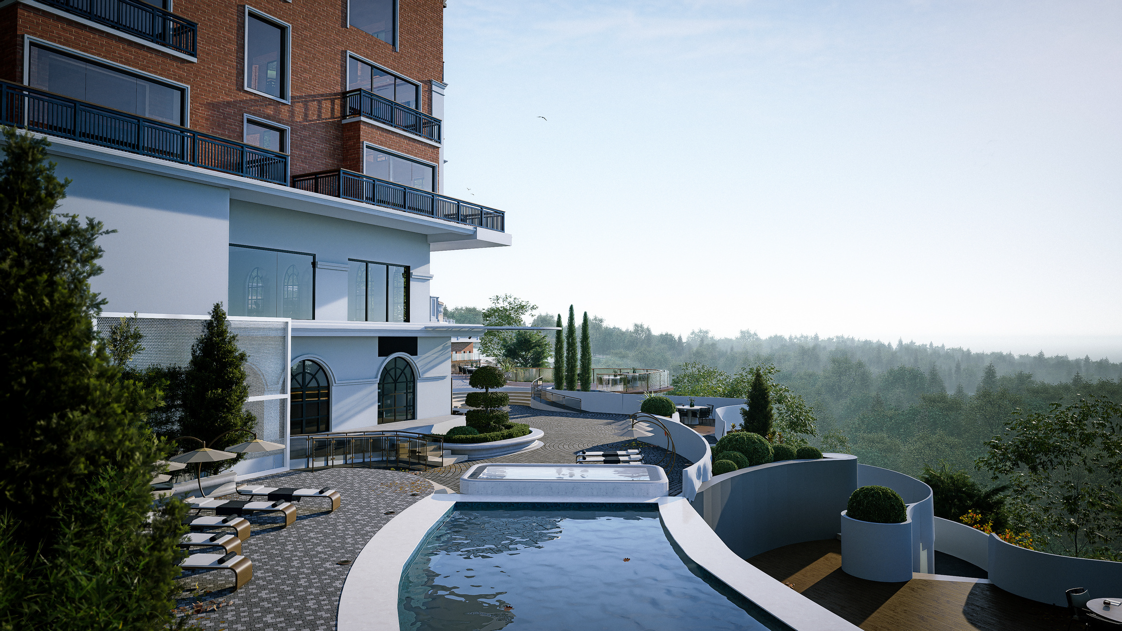 A tropical cliffside pool complemented by a floating deck, offering uninterrupted views and a relaxed yet refined setting for leisure, gentle social gatherings, and unhurried moments.